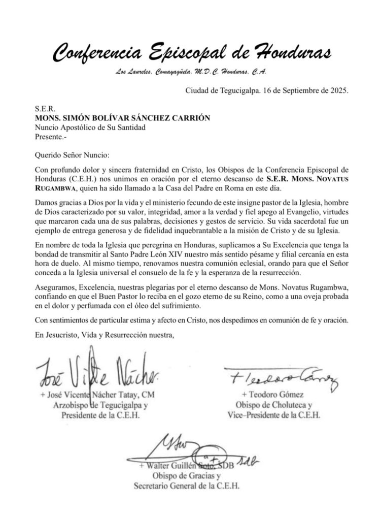 Finalmente, los obispos hondureños pidieron transmitir al papa León XIV su pésame y cercanía en esta hora de duelo, en nombre de toda la Iglesia que peregrina en Honduras.