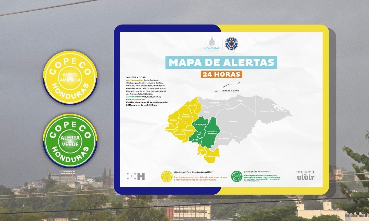 La Comisión Permanente de Contingencias (COPECO) mantiene este lunes 22 de septiembre de 2025 Alerta Amarilla en ocho departamentos del país y en los municipios aledaños al río Ulúa, mientras que los departamentos de La Paz, Francisco Morazán y Comayagua se mantienen en Alerta Verde por un período de 24 horas.