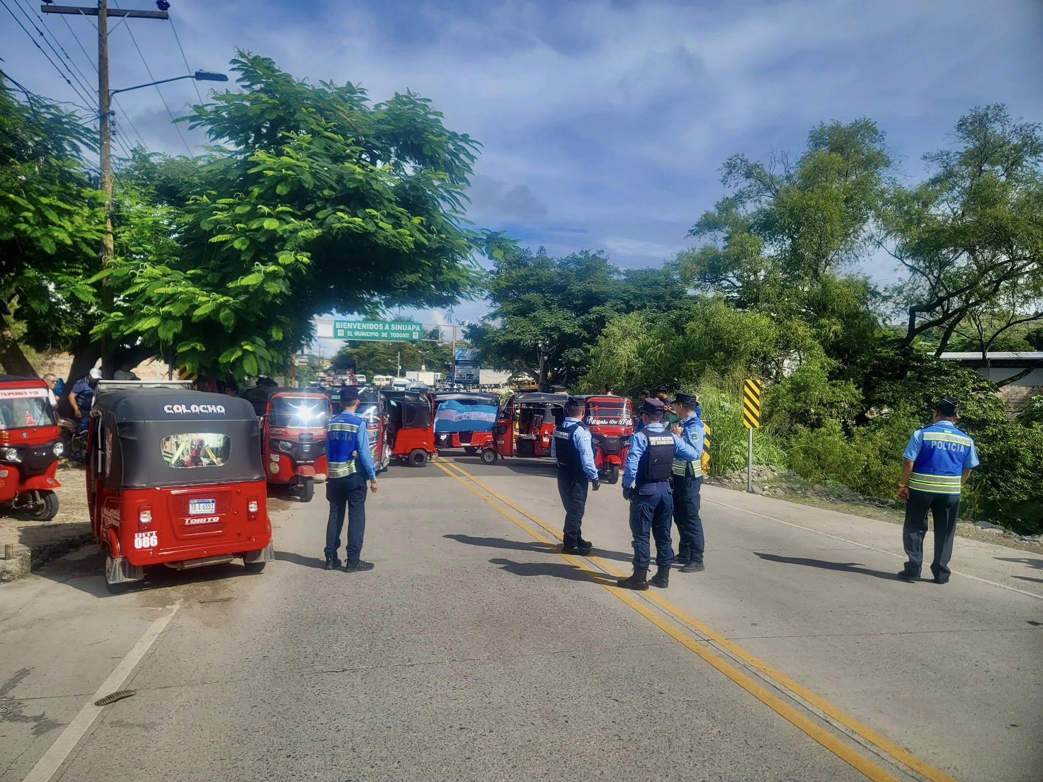 Mototaxistas mantienen bloqueado el paso en la carretera internacional CA-4, a la altura de Sinuapa, en el departamento de Ocotepeque.