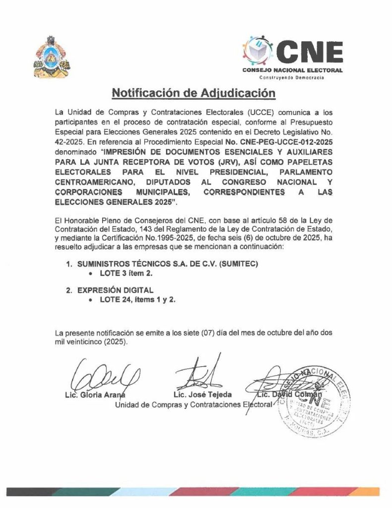 Según la resolución emitida el 6 de octubre de 2025, bajo la Certificación No. 1995-2025, el CNE asignó la impresión de materiales a dos empresas: Suministros Técnicos S.A. de C.V. (SUMITEC), a cargo del Lote 3, ítem 2, y Expresión Digital, responsable del Lote 24, ítems 1 y 2.