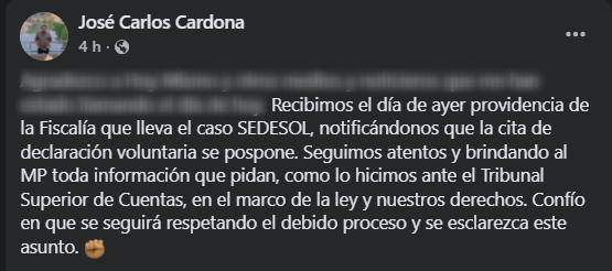 El exministro de Desarrollo Social, José Carlos Cardona, anunció que el Ministerio Público pospuso su citación para brindar declaración voluntaria en relación con el caso conocido como “Sedesolazo”. El exfuncionario explicó en sus redes sociales que fue notificado un día antes sobre la reprogramación de la diligencia.