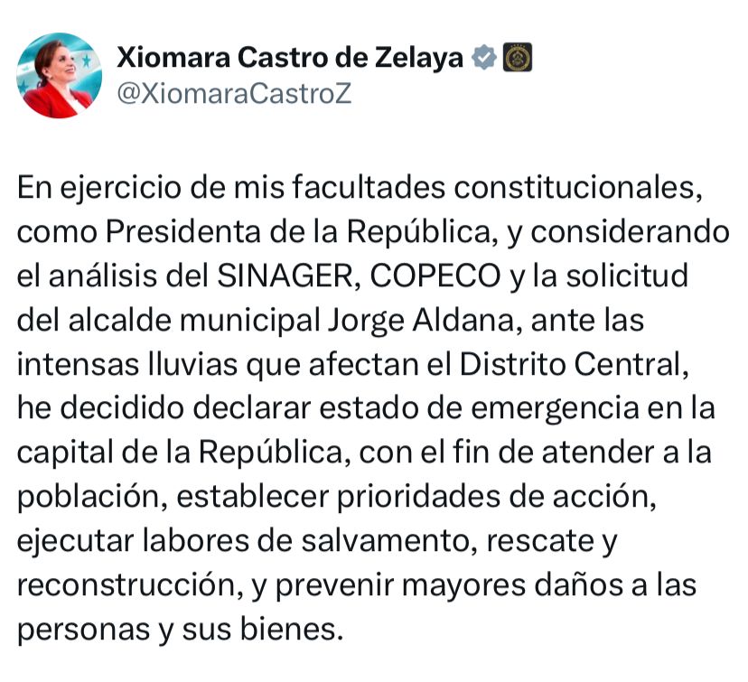 «En ejercicio de mis facultades constitucionales como presidenta de la República y considerando el análisis de Sinager, Copeco y la solicitud del alcalde municipal, Jorge Aldana, ante las intensas lluvias que afectan al Distrito Central, he decidido declarar Estado de emergencia en la capital de la República», dice parte del escrito que la mandataria publicó en su cuenta de X.