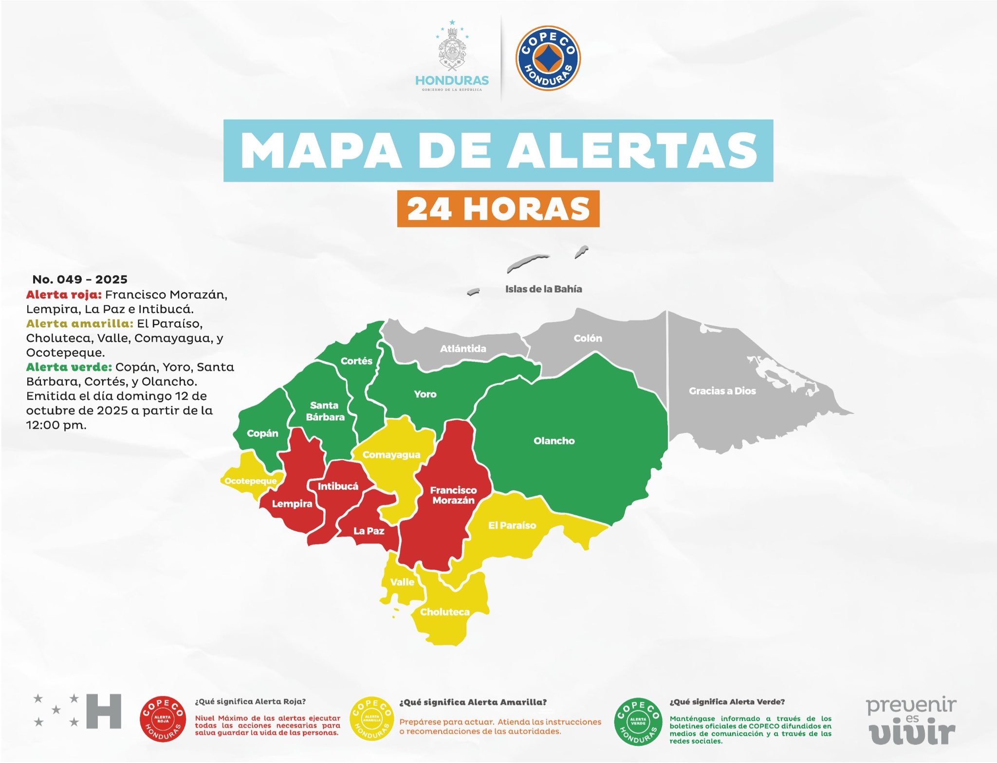 Asimismo, se amplió la alerta amarilla en Choluteca, Valle, Comayagua, Ocotepeque y El Paraíso, mientras tanto se mantiene la alerta verde en los departamentos de Copán, Yoro, Santa Bárbara, Cortés y Olancho.