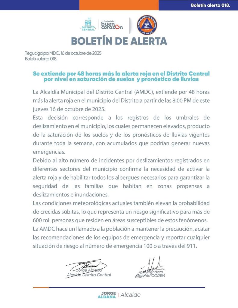 La Alcaldía Municipal extendió por un periodo de48 horas más la alerta roja en el Distrito central, debido los riesgos por deslizamientos y los pronósticos de altas lluvias durante toda la semana.
