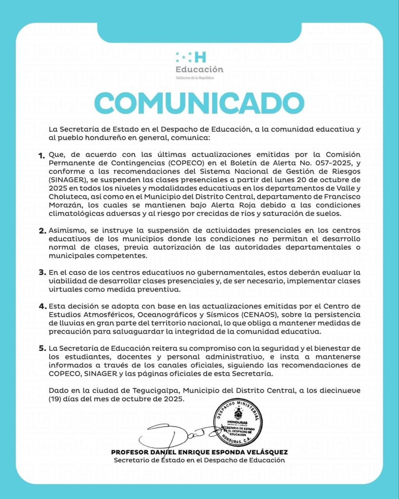 La Secretaría de Educación pidió a la comunidad educativa mantenerse informada a través de los canales oficiales y atender las recomendaciones de COPECO y SINAGER. Reiteró que la prioridad es proteger la integridad de estudiantes, maestros y personal administrativo ante el impacto de las lluvias que continúan afectando gran parte del país.
