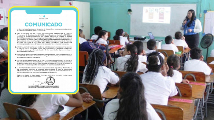 La Secretaría de Educación pidió a la comunidad educativa mantenerse informada a través de los canales oficiales y atender las recomendaciones de COPECO y SINAGER. Reiteró que la prioridad es proteger la integridad de estudiantes, maestros y personal administrativo ante el impacto de las lluvias que continúan afectando gran parte del país.