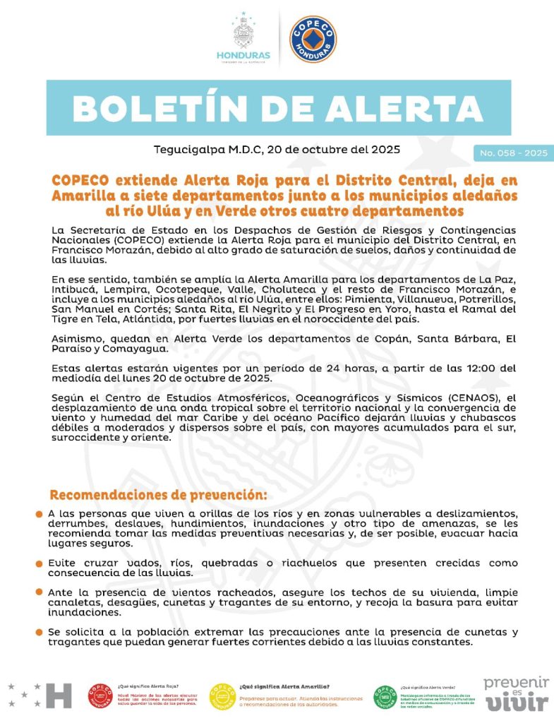 Asimismo, se amplía la Alerta Amarilla para La Paz, Intibucá, Lempira, Ocotepeque, Valle, Choluteca y el resto de Francisco Morazán, además de varios municipios del valle de Sula cercanos al río Ulúa. Copán, Santa Bárbara, El Paraíso y Comayagua continúan bajo Alerta Verde.