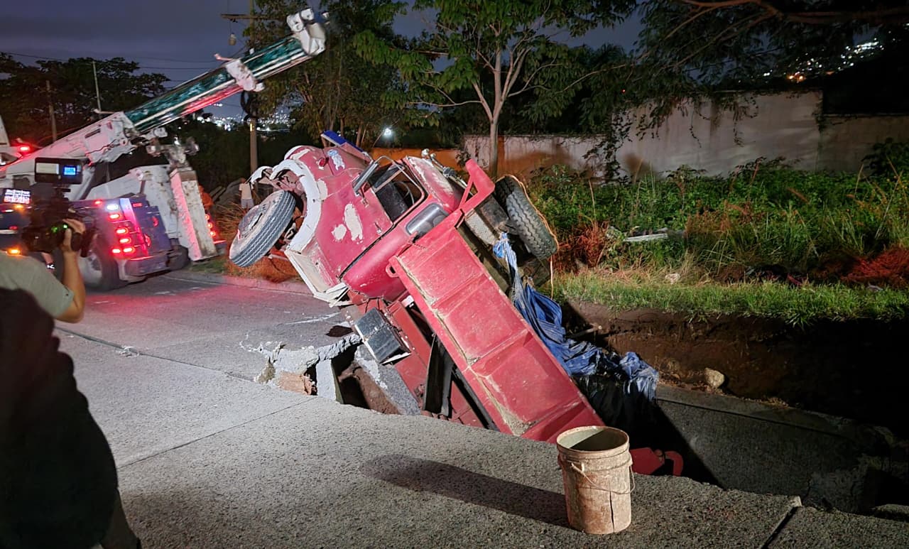 El hecho ocurrió cuando el pesado vehículo intentaba salir de la colonia con dirección al anillo periférico y parte del pavimento cedió, provocando que cayera al agujero.