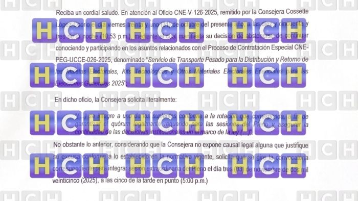 Pese a que la consejera Cossette López ha pedido desligarse y que un suplente tome su lugar para que se decida qué empresa estará encargada del traslado del material electoral, el Consejo Nacional Electoral (CNE) ha señalado que es «injustificada» la solicitud y la convoca al proceso.
