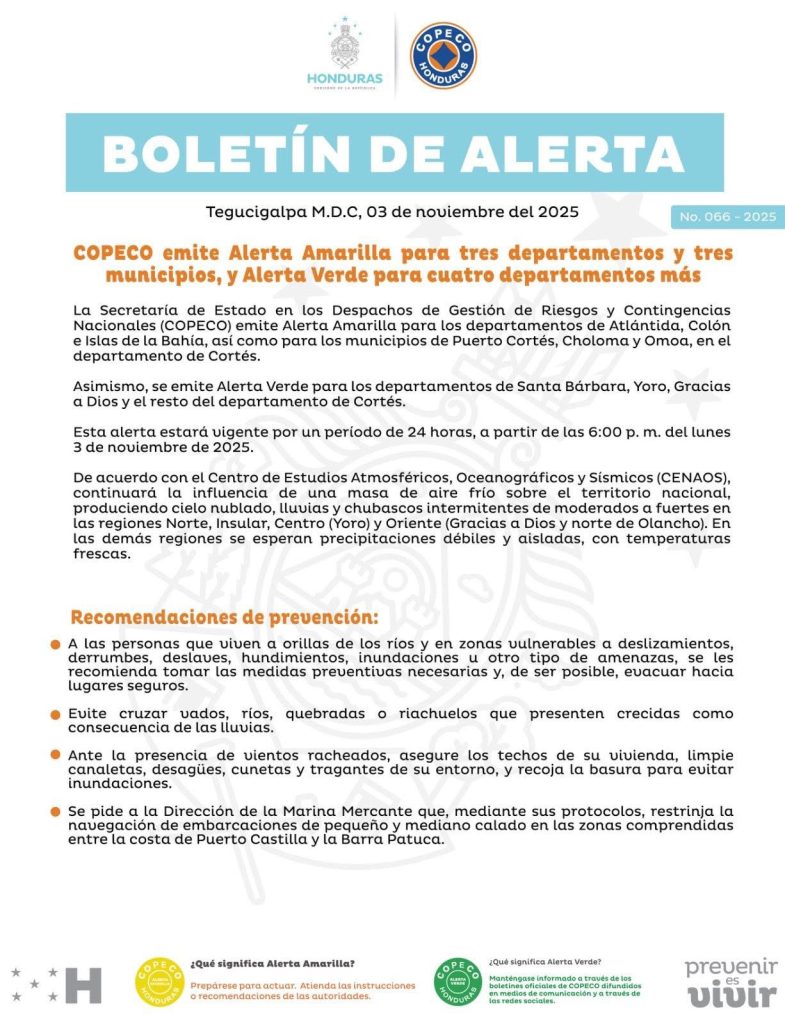 La Secretaría de Estado en los Despachos de Gestión de Riesgos y Contingencias Nacionales de Honduras (COPECO) emitió este lunes alerta amarilla para los departamentos de Atlántida, Colón e Islas de la Bahía, así como para los municipios de Puerto Cortés, Choloma y Omoa, en el departamento de Cortés-