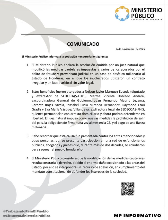 El Ministerio Público (MP) anuncia que apelará resolución que modificó las medidas cautelares impuestas al diputado nacionalista Nelson Márquez y otros funcionarios por el delito de fraude y prevaricato judicial en «caso de desfalco millonarios al Estado de Honduras».