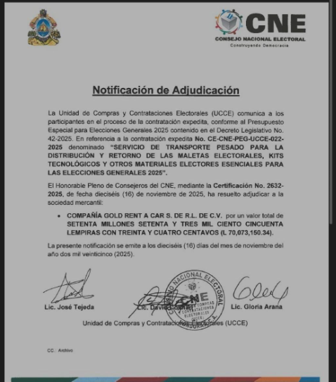 Después de varias semanas de incertidumbre y tensiones logísticas, el Consejo Nacional Electoral (CNE) adjudicó este domingo a la empresa Gold Rent a Car S. de R. L. de C. V. un contrato valorado en más de 70 millones de lempiras para encargarse del transporte de maletas electorales, kits tecnológicos y demás materiales que serán distribuidos a nivel nacional para las elecciones generales del 30 de noviembre.