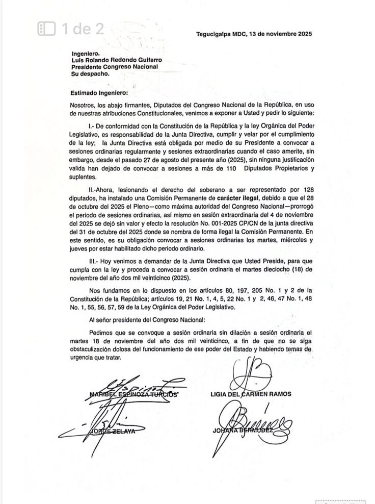 Un grupo de diputados del Congreso Nacional, encabezados por Maribel Espinoza, Ligia Ramos, Jorge Zelaya, Johana Bermúdez, entre otros, solicitaron al presidente del Legislativo, Luis Redondo, convocar de manera inmediata a sesión ordinaria este martes 18 de noviembre.