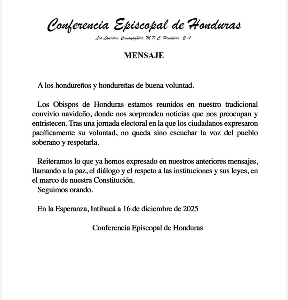 La Conferencia Episcopal de Honduras se pronunció este martes manifestando su preocupación por la situación posterior a la jornada electoral reciente.
