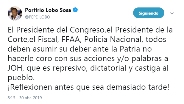 Un tweet que deja entrever el descontento de un ex presidente de Honduras, ese es el último escrito de Porfirio Lobo Sosa en su cuenta personal de twitter. Vea el mensaje que le mando a las autoridades de las principales instituciones de gobierno en el país. SA