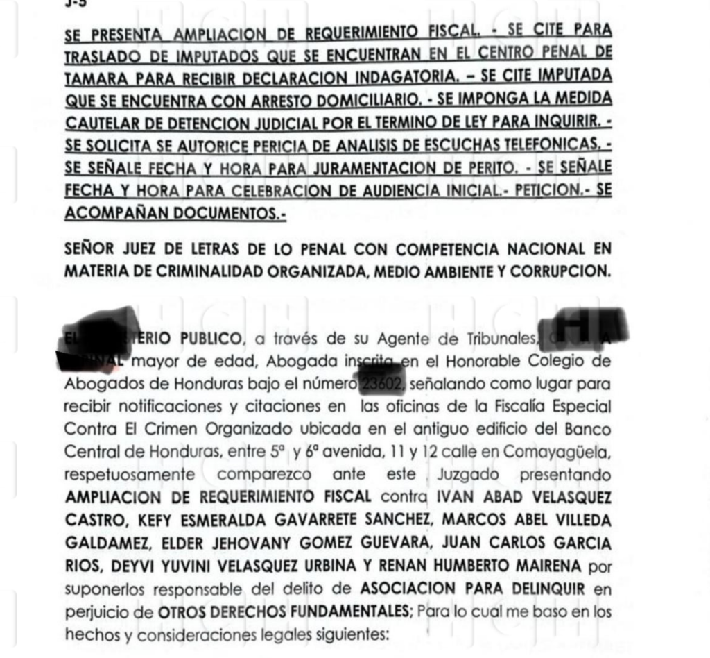 El Ministerio Público presentó este viernes una ampliación de requerimiento fiscal ante un juez con competencia nacional en criminalidad organizada, medio ambiente y corrupción, solicitando la citación de varios imputados que se encuentran en el centro penal de Támara y una persona bajo arresto domiciliario, para que rindan declaración indagatoria.