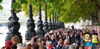 Los primeros miembros del público ingresan a Westminster Hall para ver...