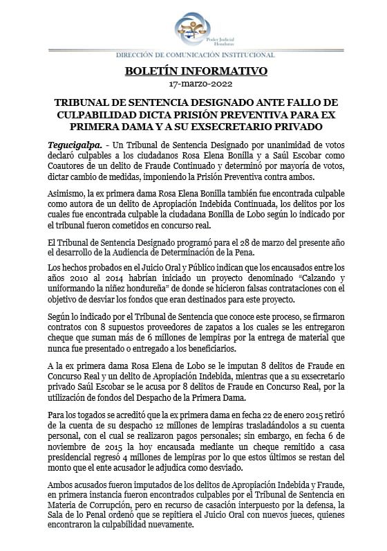 Es así que un Tribunal de Sentencia Designado consideró que la ex Primera Dama Rosa Elena Bonilla Ávila cometió los delitos de apropiación indebida y fraude, causa que inicialmente se incoó por malversación de caudales públicos, asociación ilícita y lavado de activos.