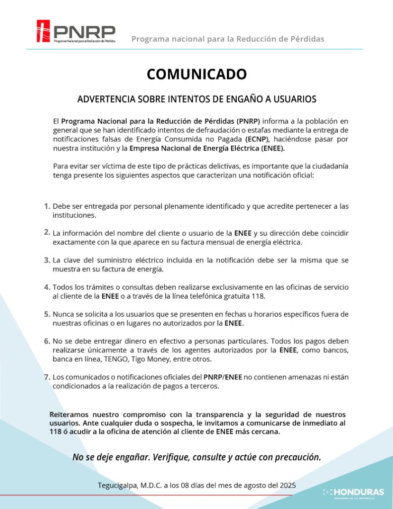 Se reportan intentos de fraudes con notificaciones falsas por supuesta Energía Consumida no Pagada (ECNP), suplantando la identidad del PNRP y la ENEE.
