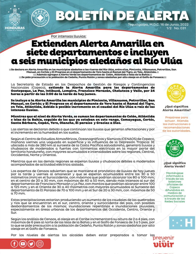 InicioACTUALIDADExtienden alerta amarilla en siete departamentos y alerta verde en el resto...