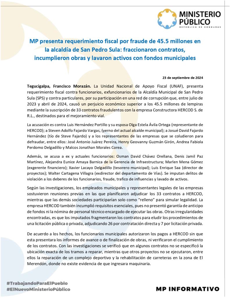 La Unidad Nacional de Apoyo Fiscal (UNAF) presentó un requerimiento fiscal contra funcionarios, exfuncionarios de la Alcaldía Municipal de San Pedro Sula y particulares por su participación en una red de corrupción que causó un perjuicio económico superior a 45.5 millones de lempiras.