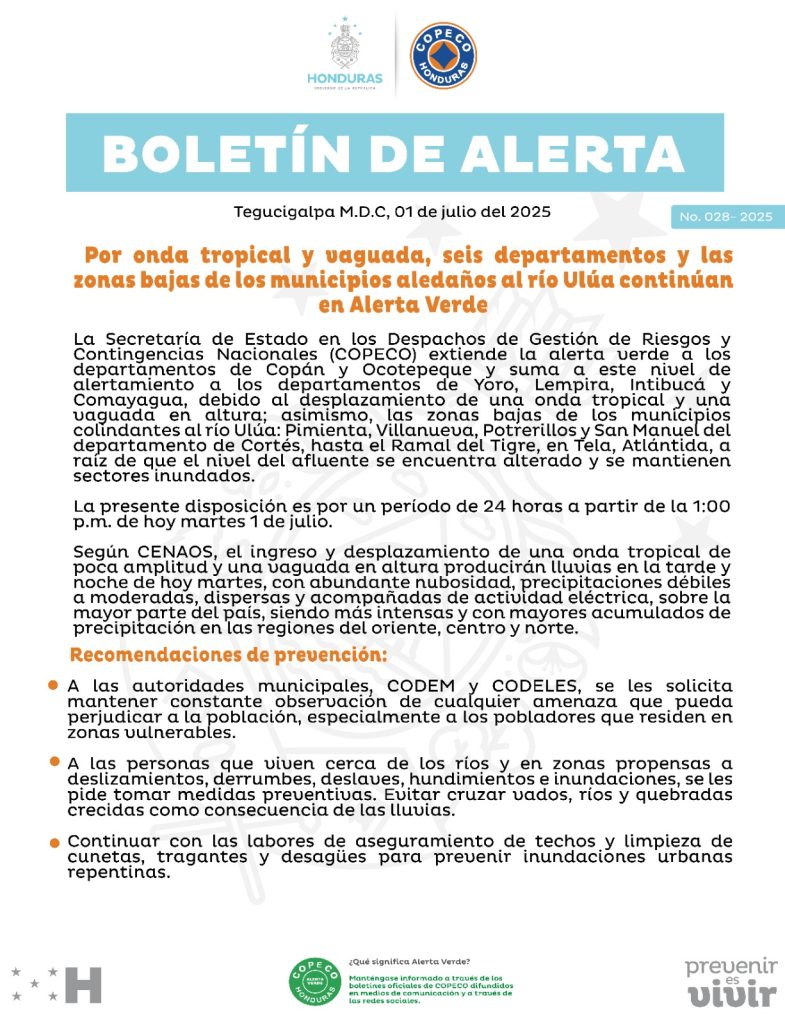 Por ingreso de onda tropical y vaguada, la Secretaría de Estado en los Despachos de Gestión de Riesgos y Contingencias Nacionales (Copeco) ha extendido la alerta verde en Copán y Ocotepeque, y también agrega a la lista los departamentos de Yoro, Lempira, Intibucá y Comayagua en Honduras.