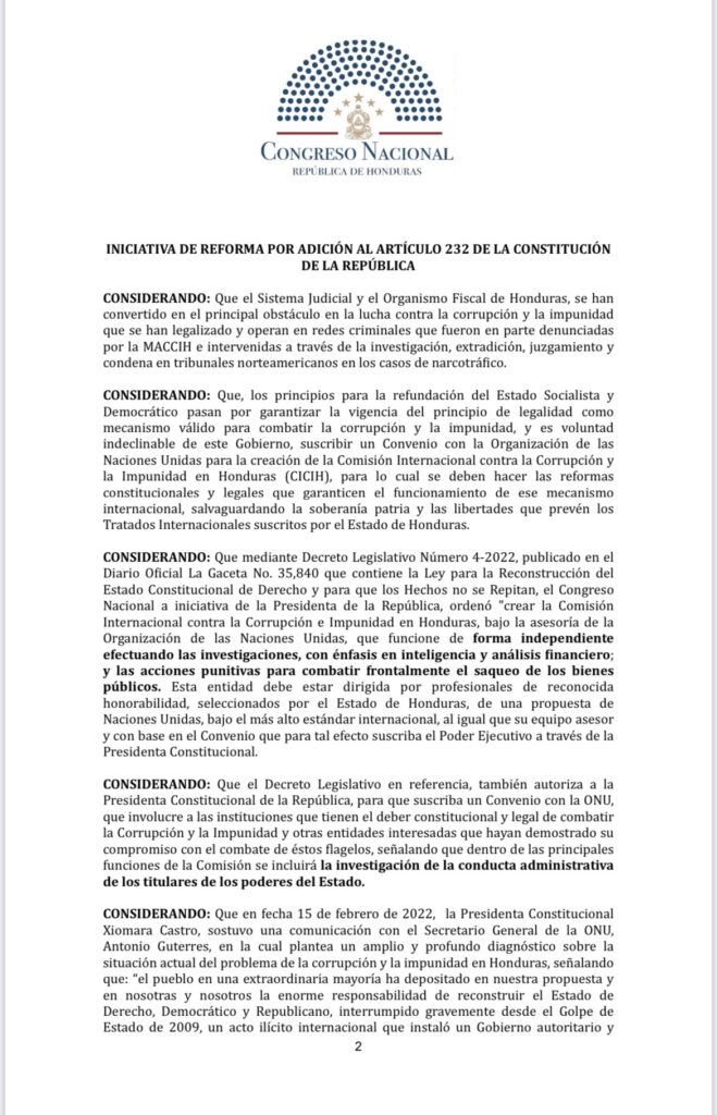 Comparto Iniciativa de Reforma por adición al artículo 232 de la Constitución de la República para combatir la corrupción e impunidad pública y privada, que presenté hoy en @Congreso_HND ante inminente llegada de la #CICIH. pic.twitter.com/x0yn1gAoJg