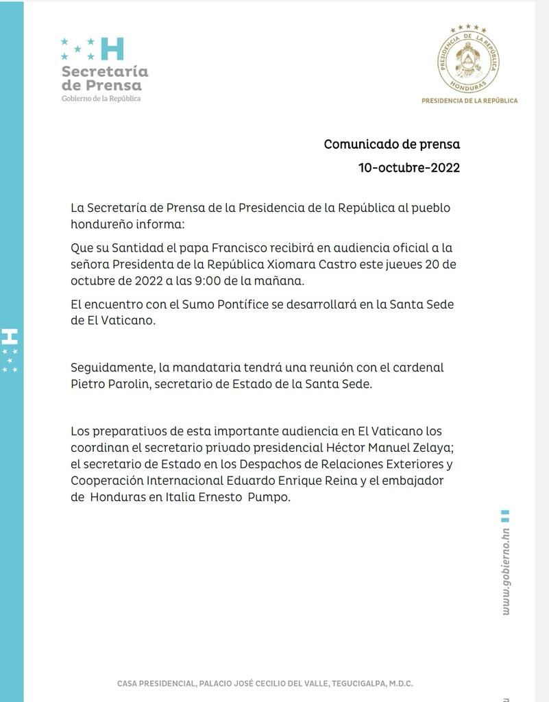 La presidenta de la República Xiomara Castro, será recibida por el Papa Francisco el próximo jueves 20 de octubre del presente año a las 9 de la mañana en una audiencia oficial.