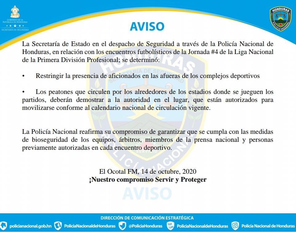 La Secretaría de Estado en el despacho de Seguridad a través de la Policía Nacional de Honduras, en relación con los encuentros futbolísticos de la Jornada #4 de la Liga Nacional de la Primera División Profesional; se determinó: