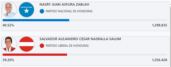 De esta forma, Nasry Asfura se mantiene con 1,298,835 marcas contra 1,256,428 de Salvador Nasralla, con 99.40% de las actas escrutadas.