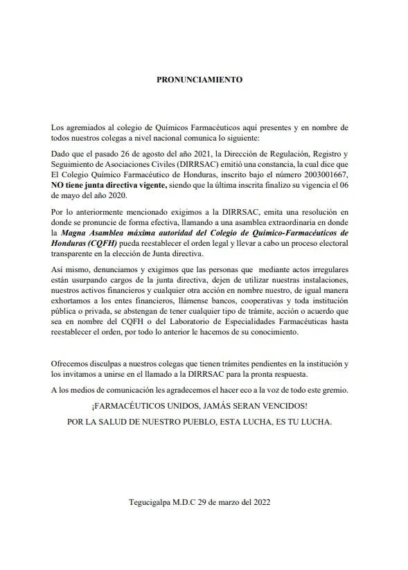InicioDENUNCIAS¡Tomado continúa el Colegio Químico Farmacéutico! Agremiados denuncian usurpación de Junta Directiva