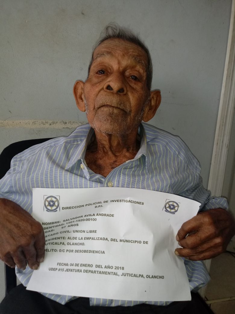 Un anciano que está a punto de cumplir 100 años fue capturado este día por elementos de la DPI en Olancho acusado de desobediencia.