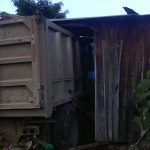 Un pesado vehículo color amarillo y negro que trabaja en el acarreo de material para  una empresa constructora, que realiza la reparación de calles en el sector, sufrió desperfectos mecánicos yéndose a incrustar contra una humilde vivienda de madera.