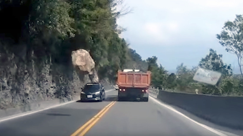 En este video registrado por la cámara de un automóvil que circulaba por una autopista que une la ciudad de Hualien con Taipéi (Taiwán, China) se observa cómo una roca gigante que se cae de la montaña lindante golpea con violencia la calzada justo frente al coche.