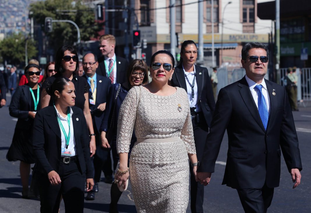 El presidente Juan Orlando Hernández y la Primera Dama, Ana García de Hernández ingresan al Congreso Nacional para participar en el traspaso de mando del presidente electo de Chile, Sebastián Piñera.