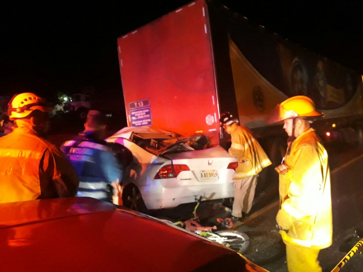 Los pormenores del accidente se desconocen, pero en la escena se pudo observar el vehículo liviano prácticamente incrustado en la parte trasera de la pesada rastra.
