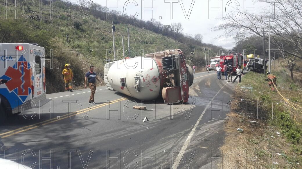 Una “pipa” de gas lpg estuvo a punto de causar una tragedia al accidentarse este sábado en el kilómetro 17 de la carretera Olancho.