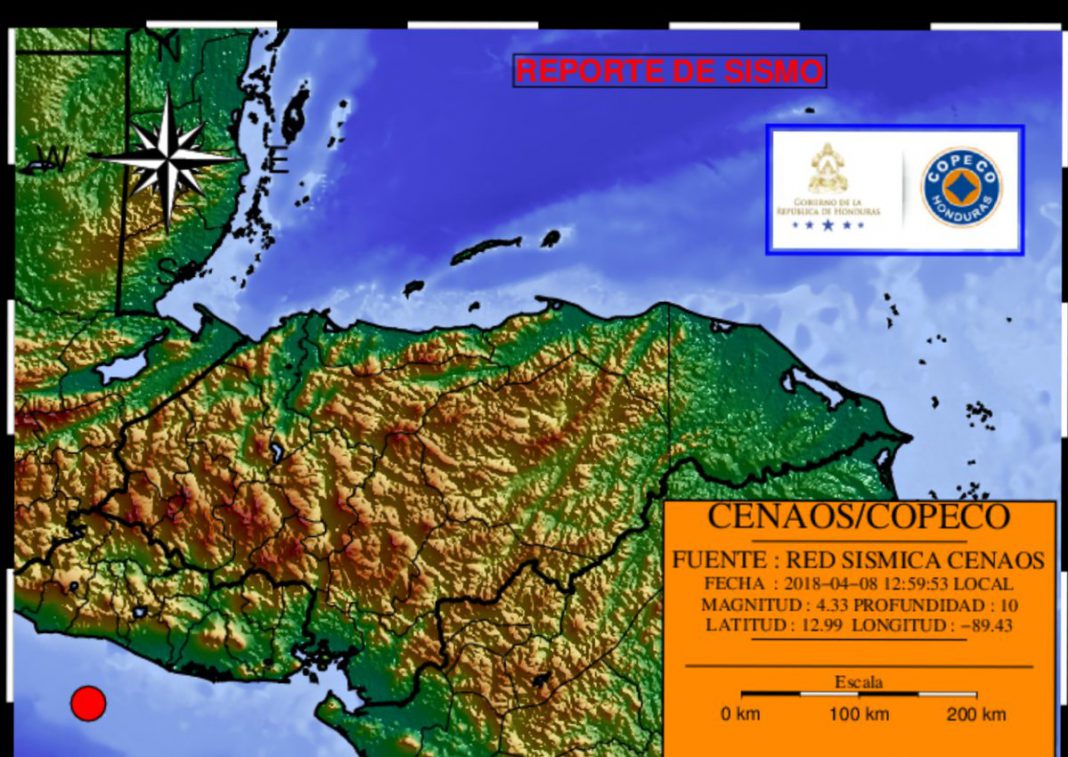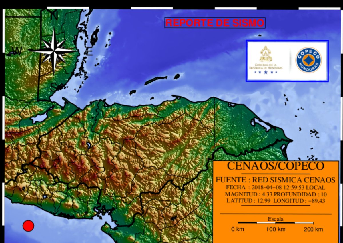 #Preliminar Evento localizado automaticamente por red sísmica de #Copeco Un evento sismico de magnitud 4.33 fue detectado en: La Costa del Pacífico con fecha 2018-04-08 12:59:53 Tiempo local Con coordenadas latitud 12.99 y longitud -89.43 teniendo una profundidad de 10 Km