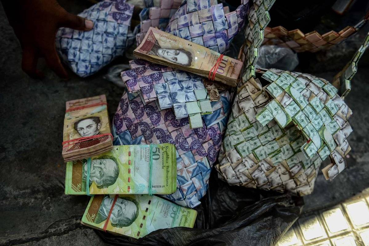 El artesano dice que con lo que gana vendiendo uno de estos bolsos, alrededor de US$10, puede comprar muchas más cosas que tratando de gastar o cambiar los billetes que usó para hacerlos.