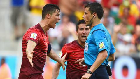 Cuando Cristiano se cruce con Milorad Mazic en Kiev probablemente se acordará del Mundial de Brasil. El árbitro serbio pitará la final de la Champions entre el Real Madrid y el Liverpool el próximo día 26, pero hace cuatro años desesperó al siete en un Alemania-Portugal que terminó 4-0 y con la selección portuguesa eliminada del torneo. Cristiano estalló en un arrebato de ira, casi encima del trencilla balcánico, como pocas veces se le recuerdan…