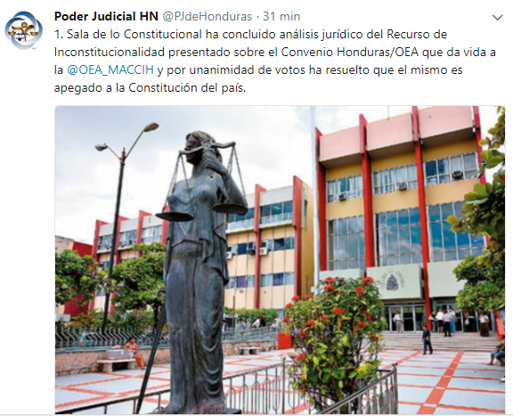 Tras largas y rigurosas deliberaciones la sala de lo constitucional, de la Corte Suprema de Justicia, falló por unanimidad de votos declarar la creación de la Misión de Apoyo Contra la Corrupción y la Impunidad (MACCIH) como apegado a los preceptos de la Constitución de la República.