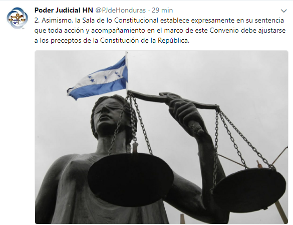 El fallo establece la constitucionalidad del decreto legislativo que dio vida a la MACCIH 23-2016 y además determina que otros mecanismos derivados dentro del convenio entre el estado de Honduras y la OEA en el marco de la MACCIH debe ser adecuado.