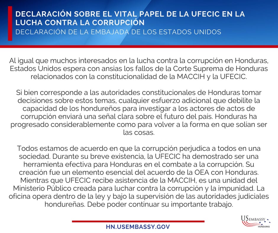 Embajada de EE.UU. espera que la MACCIH y UFECIC-MP sigan combatiendo la corrupción en el país