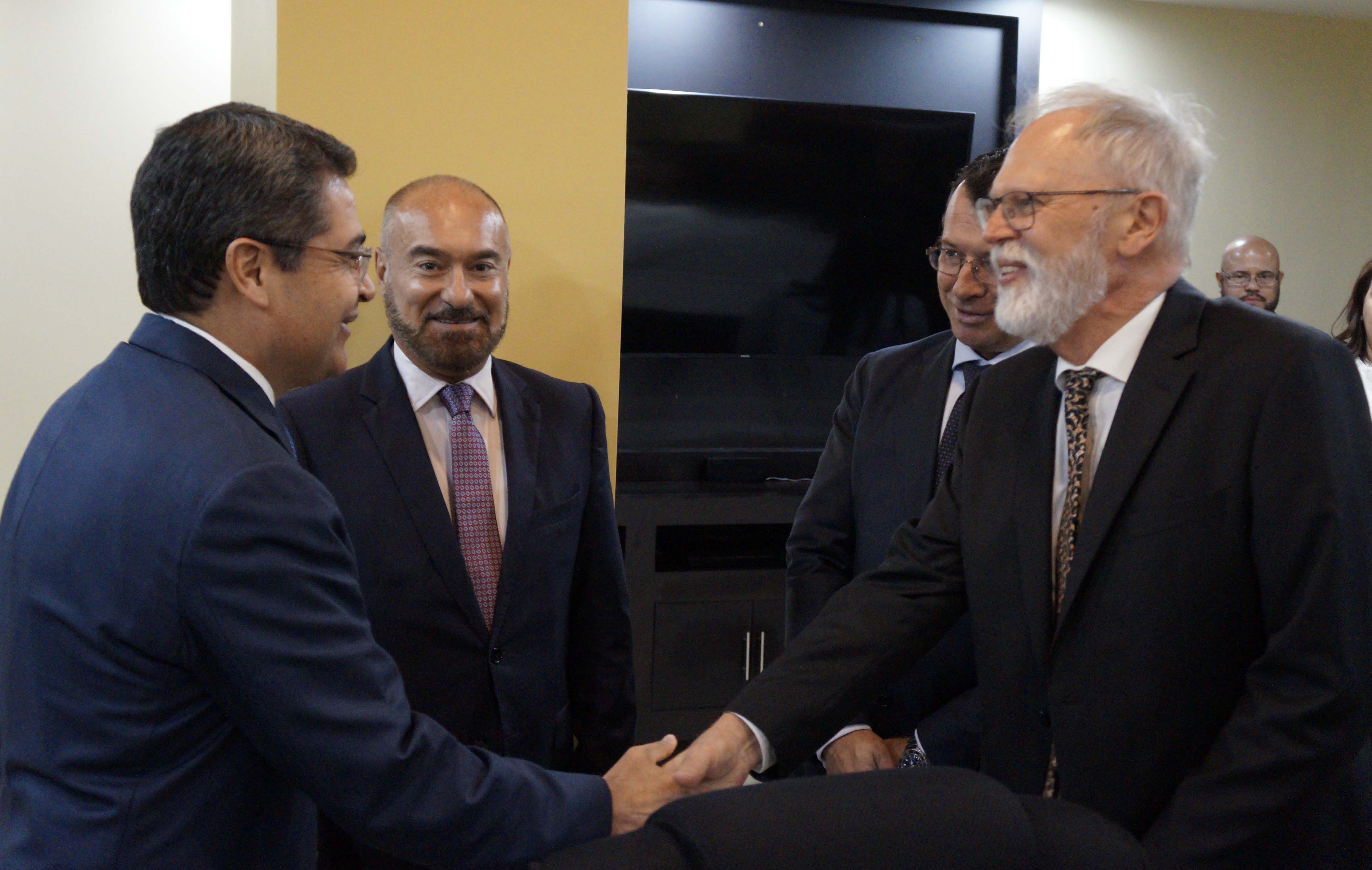 El gobernante fue acompañado por el embajador de Honduras en Washington, Marlon Tábora, y el canciller de la República, María Dolores Agüero, quien refirió que la conversación se centró en la promoción de inversiones, el turismo y la candidatura de Honduras a la presidencia de la 73 ° Asamblea de la Organización de Naciones Unidas (ONU).