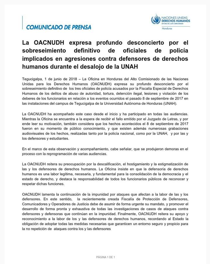 OACNUDH lamenta sobreseimiento definitivo contra policías que agredieron a defensores de derechos humanos