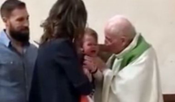 Sin embargo, esa actitud solo asusta aún más al menor y, en lugar de tratar de tranquilizarlo, el cura decide darle una bofetada para que se calle. Tras esto, el hombre que está detrás, presumiblemente el padre del bebé, arrebata no sin esfuerzo al pequeño de las manos del clérigo, que se rehusaba a entregarlo.