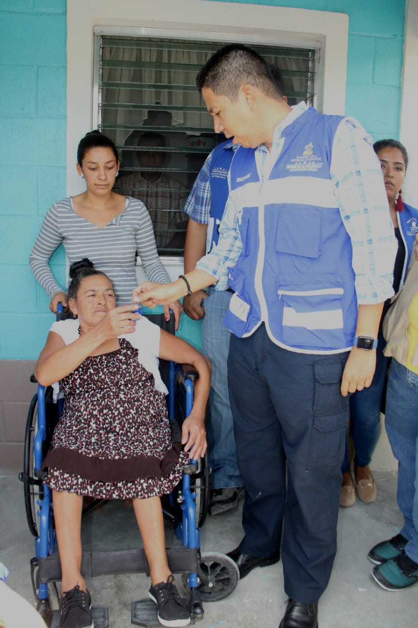 La beneficiaria es doña Blanca Rosa Galvez quien nació con una joroba en la espalda provocada por una enfermedad congénita motora que le impide movilizarse libremente y se ve obligada arrastrarse, pero recibió una silla de ruedas para facilitar su movilidad a través del programa Honduras para Todos por medio del cual también se gestionó la nueva vivienda.