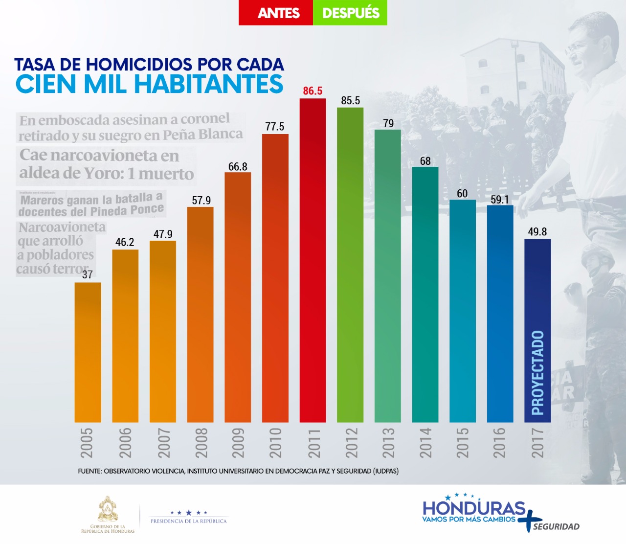 Honduras al ser considerado uno de los países más violentos del planeta registró la estadística de 87 homicidios por cada cien mil habitantes, un registro que empezó a bajar de manera sostenida en los últimos años y que se pretende cierre en 2018 en menos de 40.