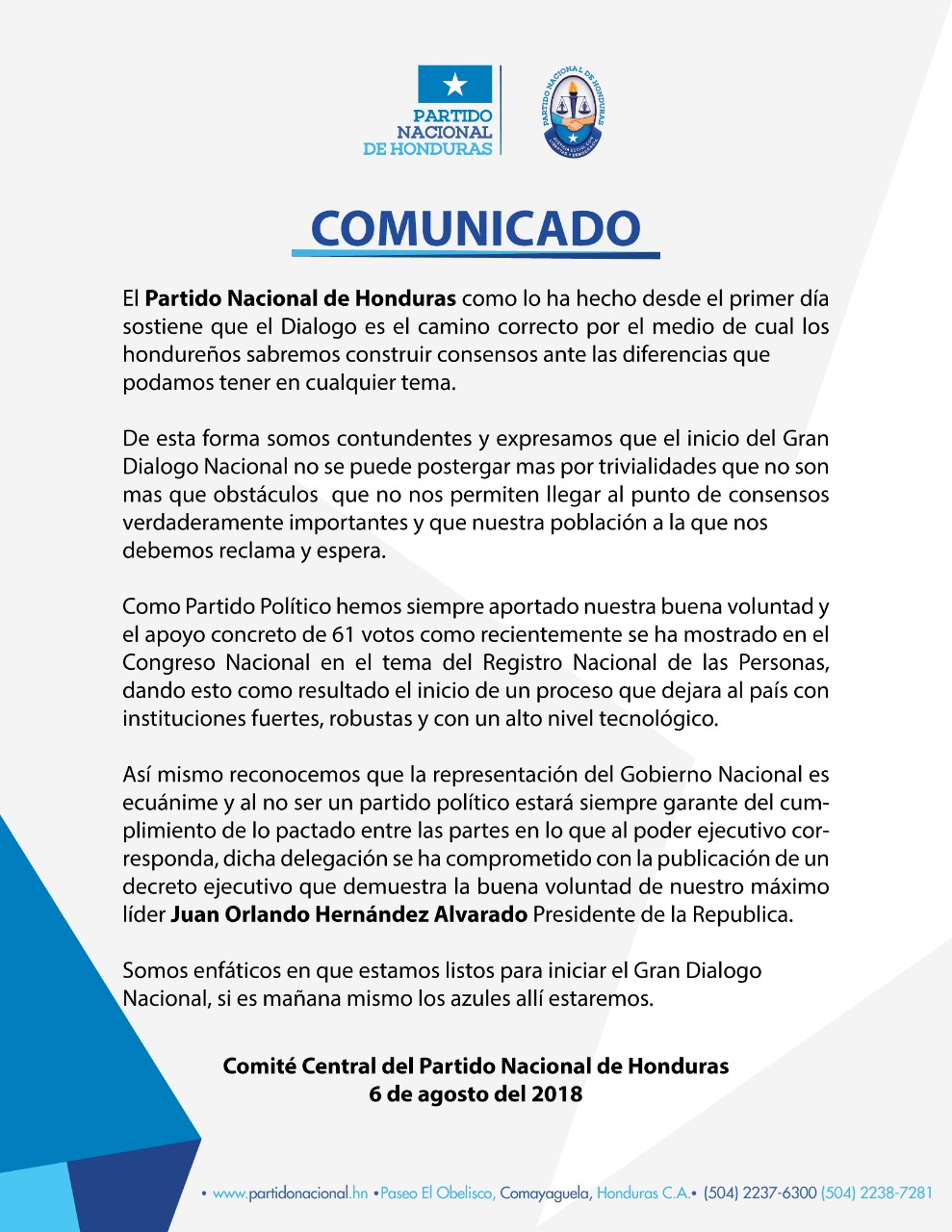 El Dialogo Nacional no se puede postergar mas por trivialidades que no son mas que obstáculos:Partido Nacional