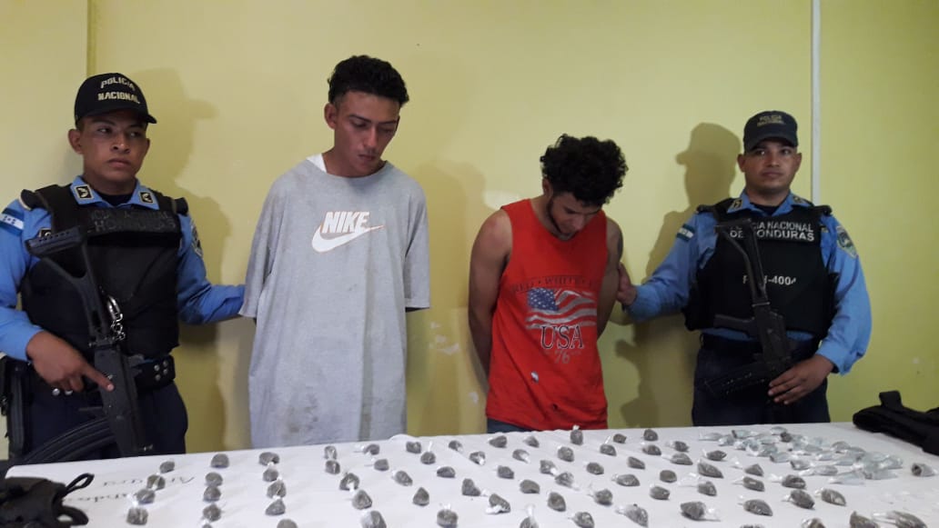A los detenidos se les encontró 132 bolsitas de marihuana, 14 bolsas de crack, 11 de cocaína, chalecos anti balas, un arma de fuego calibre 38 y 24 proyectiles.